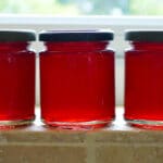 Check to see that the setting point has been reached by dribbling a small amount of the juice onto the plate you’ve chilled in the freezer. Leave it for a minute and then push at it from the edge with your fingertip. If the jelly crinkles up, then the setting point has been met and you can move on to step 8. If it just moves aside in a liquidy way and without any crinkling then continue boiling.