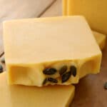 Pumpkin puree soap recipe that makes 5-6 bars using the cold-process method. Ingredients include homemade pumpkin puree, pumpkin seeds, and a blend of essential oils that replicates a natural pumpkin spice scent. The lye solution includes less water than usual as the pumpkin puree is 90% water. Technical information: 16 oz / 454 g / 1 lb batch -- 6% superfat